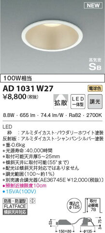 コイズミ照明 KOIZUMI ダウンライトAD1031W27 パウダリーホワイト塗装調光タイプ 電球色防雨・防湿型LED一体型 ベースタイプ100W相当 埋込穴Φ125mm